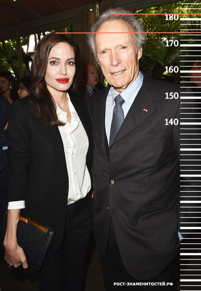 Рост Клинта Иствуда составляет 182 сантиметра. На втором фото актер не держит спину ровно, поэтому его рост мы выставили на отметке 182 вместе с толщиной подошвы его обуви. Рост Анджелины Джоли остановился на отметке 175 сантиметров, но мы вычтем из этого значения высоту каблука актрисы в 10 сантиметров (как это видно на первом фото) и получим то же самое значение, что и ранее.