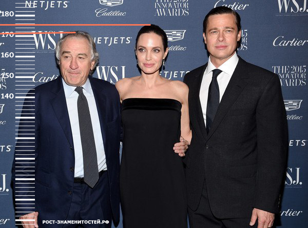 И напоследок рассмотрим еще несколько фото, где сравним рост актрисы с ростом Роберта Де Ниро (171 см). Первое и второе фото сделаны на одном мероприятии, и как видим, высота каблука Анджелины Джоли примерно 10 сантиметров, соответственно за его вычетом рост актрисы остановился на отметке 165-166 сантиметров. На третьем фото Анджелина в обуви с тонкой подошвой, поэтому Роберт Де Ниро выше нее на 6-7 сантиметров.