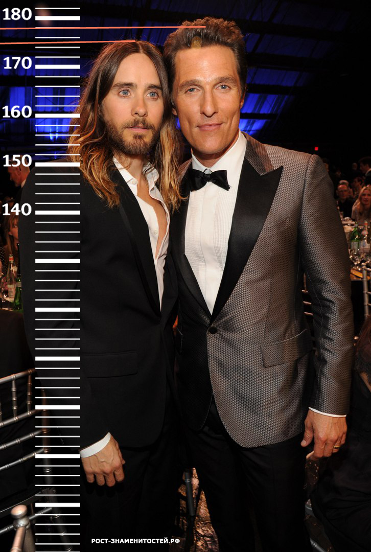 И напоследок рассмотрим пару фото, где Джаред Лето стоит рядом с Мэттью Макконехи, рост которого, как мы выяснили, достигает 178 сантиметров. Оба фото сделаны в разное время, и разница между актерами в росте остается неизменной.