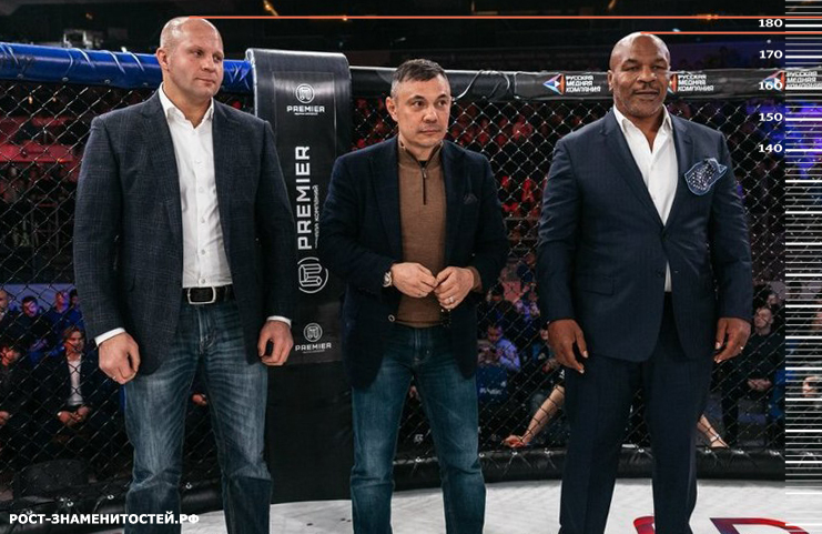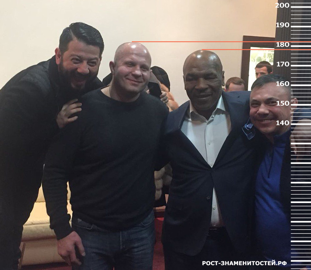 Для начала рассмотрим несколько фото, где сравним Федора Емельяненко с Майком Тайсоном, рост которого составляет максимум 178 сантиметров. Во всех трех случаях разница между бойцами остается неизменной — не более 4 сантиметров, а значит и рост Федора Емельяненко не превысит отметки 182.