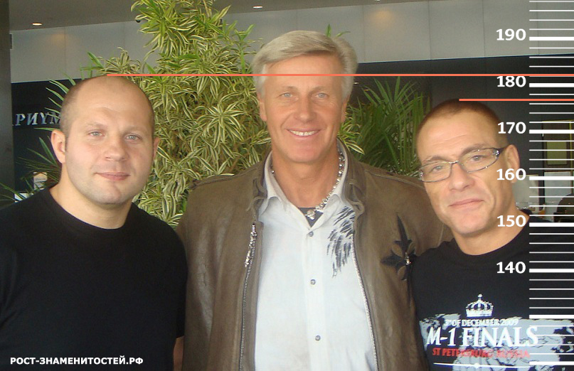 Также рассмотрим еще несколько фото, где сравним рост Федора Емельяненко с ростом Жан-Клод Ван Дамма (177 см). Как и в предыдущем случае, разница между бойцами не меняется, и рост Федера снова не превысил отметки 182 сантиметра.