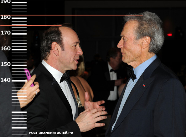 Далее рассмотрим фото, где актер стоит рядом с Клинтом Иствудом, рост которого достигает максимальной отметки 182. Здесь ситуация не меняется, и рост Кевина Спейси снова не превышает 176 сантиметров.