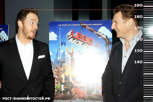 И напоследок рассмотрим фото, где сравним рост Лиама Нисона с ростом Криса Прэтта (187 см). Здесь разница между актерами 3 сантиметра.