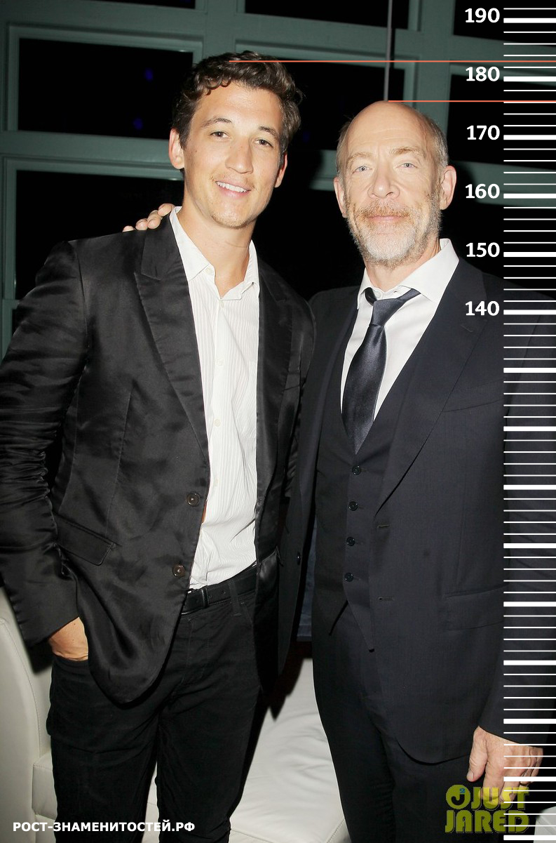 На следующих пару фото сравним рост актера с ростом Джонатана Кимбла Симмонса (176 см). Здесь уже рост Майлза Теллера остановился на отметке 182-183 сантиметра.
