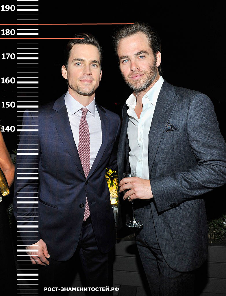 Рост Криса Пайна равен 183-184 сантиметра. Здесь также рост Мэтта Бомера остановился на отметке 178 сантиметров, как и в предыдущем случае.