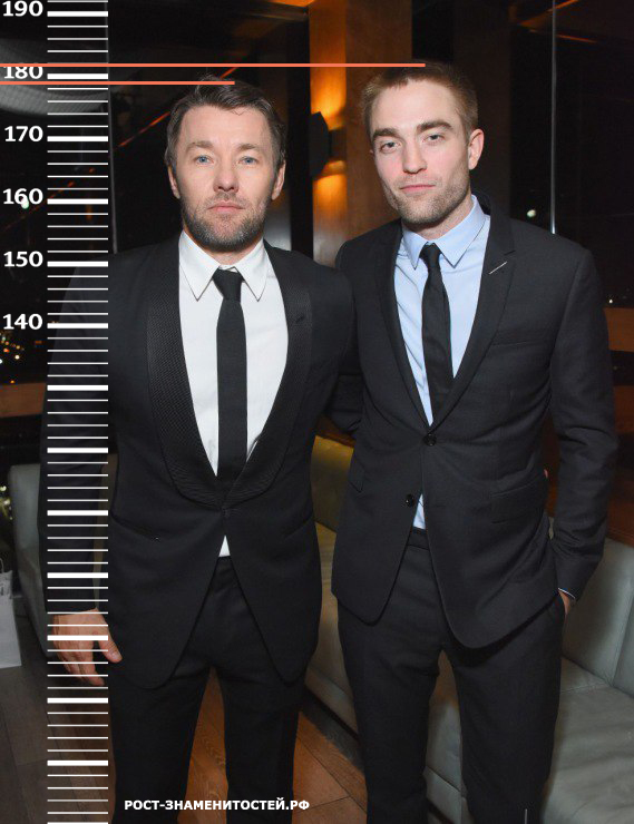 Для начала рассмотрим фото, где Роберт Паттинсон стоит рядом с Джоэлом Эдгертоном, рост которого составляет 179-180 сантиметров. Как видим разница между ними пару сантиметров (+- из-за обуви), а значит и рост Роберта будет на отметке примерно 182.