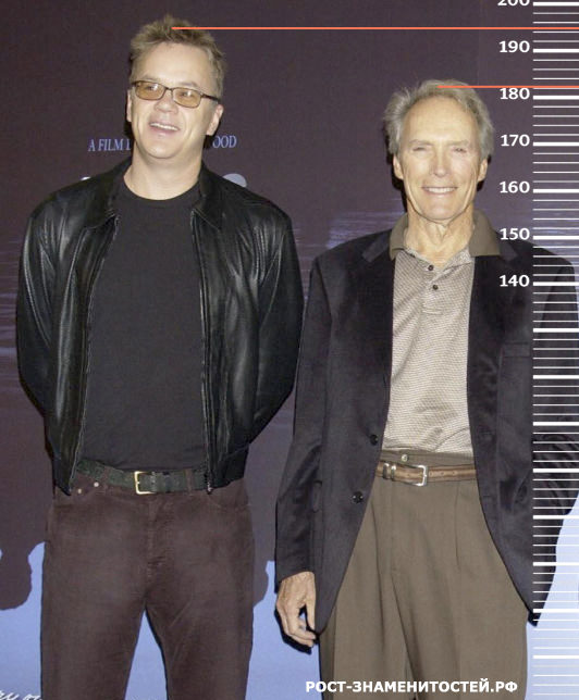 Также рассмотрим еще одно фото, где актер стоит рядом с Клинтом Иствудом, рост которого достигает максимальной отметки 182 сантиметра. Как видим, здесь картина не меняется, и рост Тима Роббинса снова на той же отметке, что и в предыдущих случаях.