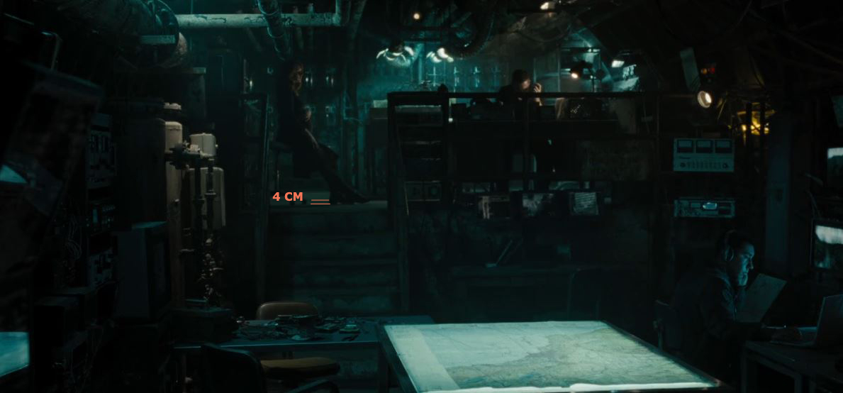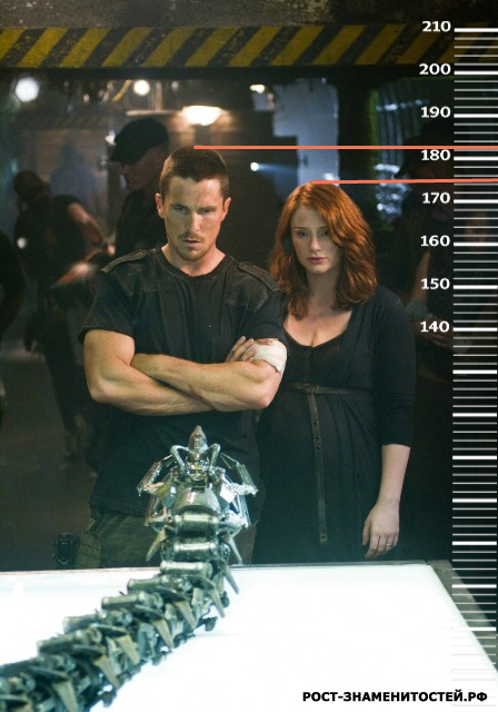 Далее рассмотрим кадры из фильма «Терминатор 4», где сравним рост Брайс Даллас Ховард с ростом Кристиана Бэйла (180 см). На первом кадре видно, что высота каблука у актрисы примерно 4 сантиметра; на втором кадре — толщина подошвы актера примерно 3. Соответственно на третьем кадре рост Кристиана Бэйла мы обозначили на отметке 183, а рост Брайс на отметке 175 сантиметров. Вычтем из этого значения высоту каблука и получим 171 сантиметр.