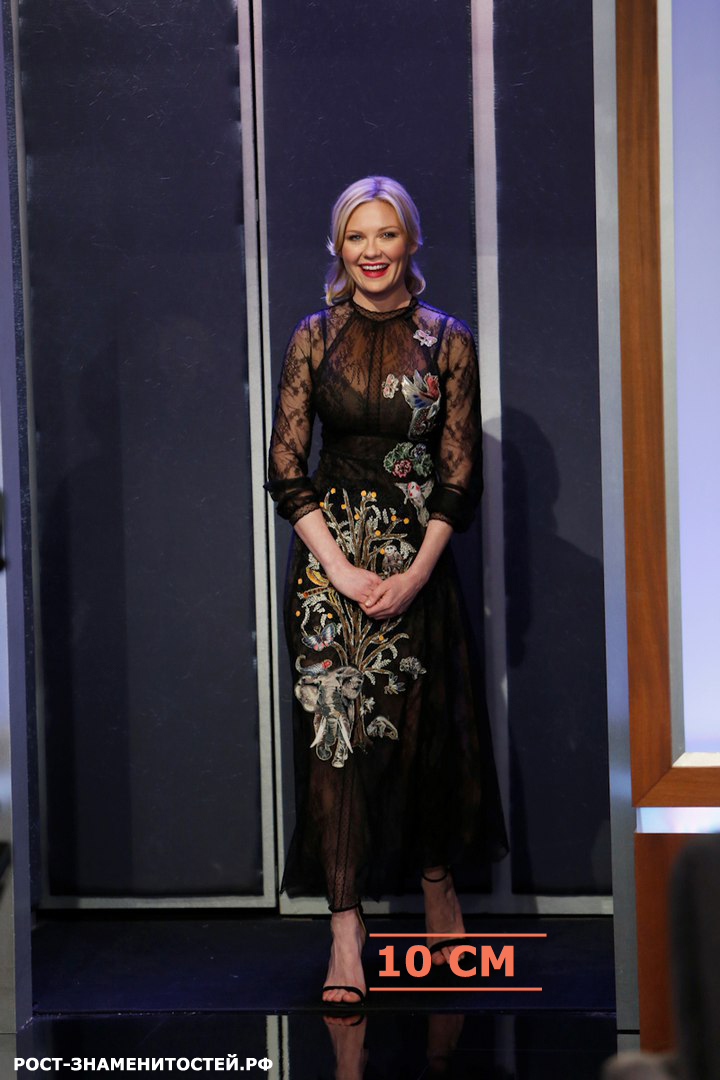 Для начала рассмотрим несколько фото, где сравним рост актрисы с ростом Джимми Киммела (181 см). На фото обозначим его рост на отметке 184 из-за обуви. Кирстен Данст появилась оба раза на шоу в обуви с примерно одинаковой высотой каблука (10 см), и в обоих случаях ее рост в обуви достигает отметки 176 сантиметров. Вычтем из этого значения высоту каблука и получим рост 166 сантиметров.