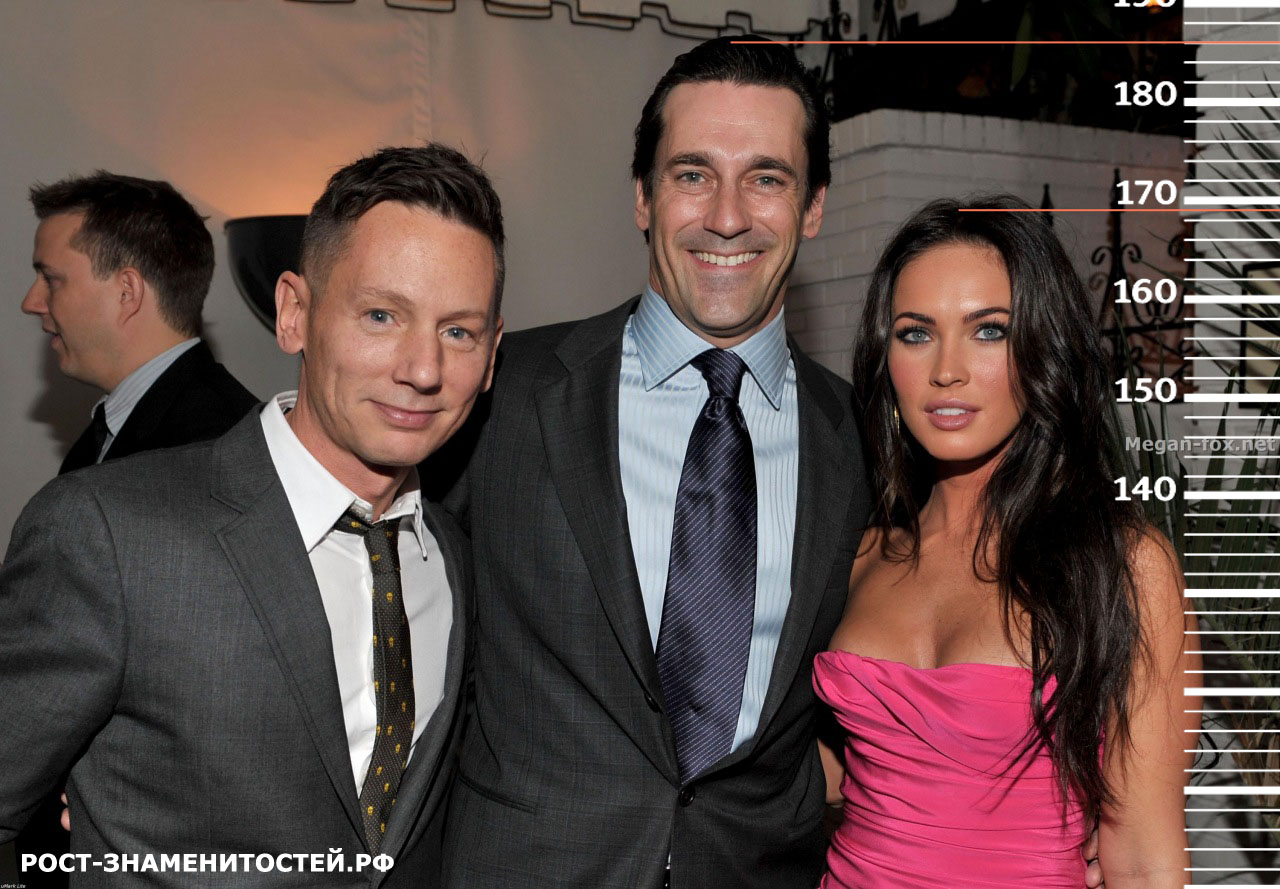 На следующих нескольких фото сравним Меган Фокс с Джоном Хэммом (184 см). На фото выставим его рост на отметке 186 из-за обуви. В обоих случаях актриса появилась на мероприятиях на каблуках высотой 8-9 сантиметров. При вычете этого значения, ее рост остановится на отметке примерно 160-161.
